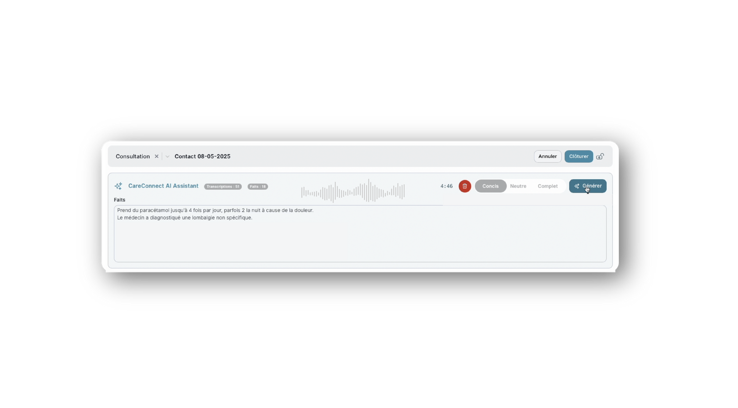 Commencez votre consultation et appuyez pour enregistrer. CareConnect AI Assistant écoute alors l’entretien pendant toute la consultation. Il convertit en temps réel l’échange oral en notes écrites. Vous pouvez ainsi consacrer toute votre attention au patient.